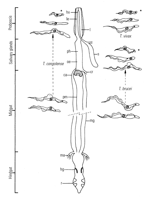 * = infective metatrypanosomes