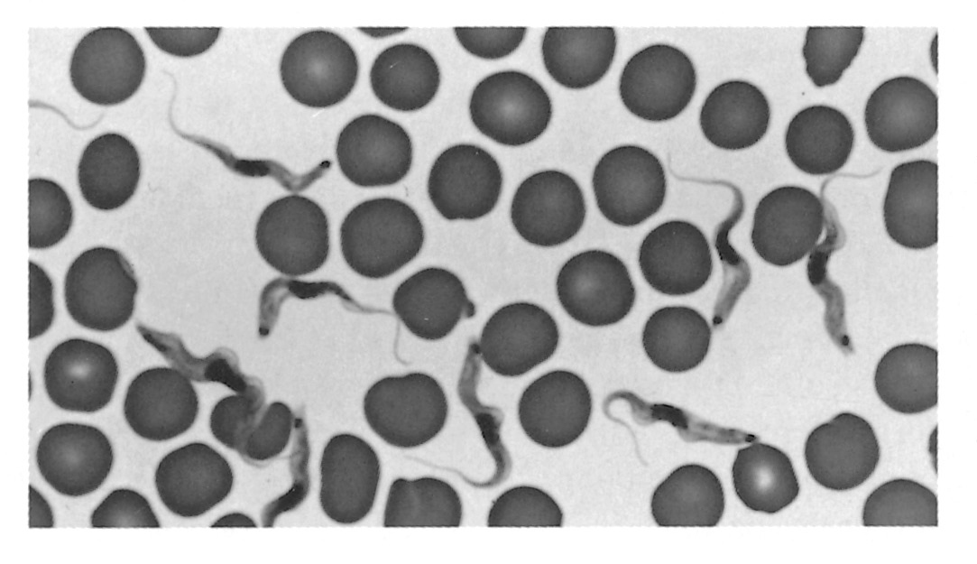 As a consequence of their pathogenicity and their complex and fascinating biology, the salivarian trypanosomes have been, and will continue to be, the subject of intense research. The remarkable alternate adaptations of these extracellular parasites to mammalian and insect hosts are reflected in morphological changes that are readily detectable by light microscopy. Bloodstream forms are trypomastigotes (Figure 12.2); from the posterior portion of an elongated body, some 8 to 35 μm long, arises a flagellum which extends anteriorly, and which is connected to the body by an undulating membrane. Beyond the anterior extremity of some species, the flagellum may extend free of attachment to the undulating membrane. The beating of the flagellum pulls the trypanosome forwards, imparting characteristic motility. Within the cell, in a posterior position and at the base of the flagellum, a kinetoplast is found, and a single nucleus is located almost halfway along the body. In the tsetse fly, trypomastigotes transform to epimastigotes (synonymous with the crithidial stage in the old terminology) in which the kinetoplast has migrated anteriorly, to a position adjacent to the nucleus (Figure 12.2). Differences in the morphology of the trypomastigote stages of the various species form the basis for differential diagnosis. The major characteristics are clearly seen in thin blood smears, stained with Giemsa’s, Leishman’s or other Romanovsky stains. Trypanosoma congolense (Figure 12.3a) and T. vivax (Figure 12.3b) are monomorphic parasites, whereas T. brucei is polymorphic (Figure 12.3c). Trypanosoma congolense is the smallest species and is between 8 and 20 μm in length.