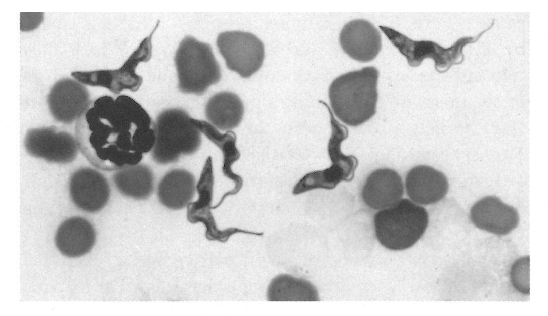 The occurrence of T. theileri in healthy cattle throughout the world111 exemplifies a well-developed host–parasite relationship. This stercorarian species is the largest trypanosome of cattle, and bloodstream forms reach a length of 100 μm. This stage is characterized by a long, thin, pointed posterior end, a long, free flagellum and a prominent undulating membrane. The large kinetoplast lies far from the posterior extremity, often in a marginal position. The nucleus is found midway along the body. However, these parasites are infrequently seen since infections are characterized by low parasitaemia. Within the bovine, T. theileri multiplies by binary fission in the tissues, mainly in the epimastigote form. When multiplying parasites are found in the bloodstream, polymorphic ‘immature’ forms are present.
