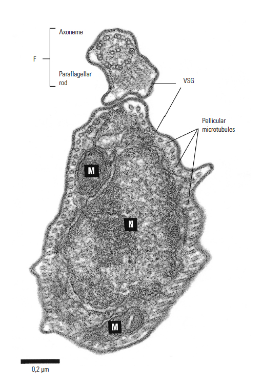 Figure 12.4 Electron microphotograph of Trypanosoma congolense: cross-section showing flagellum (F), nucleus (N), mitochondrion (M) and variable surface glycoprotein coat (VSG), x86 000. Bar represents 0,2 μm. (Unpublished electron micrograph by courtesy of Dr P. Webster, Yale University School of Medicine, Department of Cell Biology, New Haven, CT)