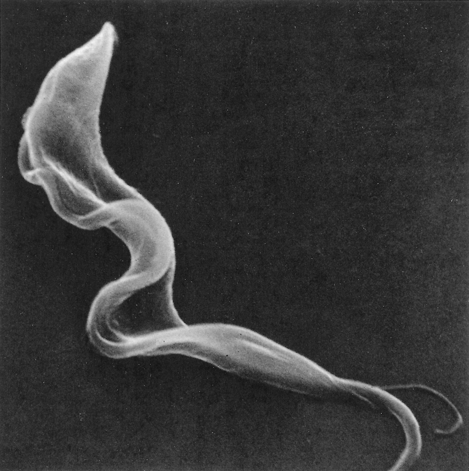 Figure 12.6 Scanning electron micrograph of an intermediate (bloodstream) form of Trypanosoma brucei from the blood of a mouse. Note the prominent undulating membrane, pointed posterior end and long, free flagellum. A ‘streamer’ or filopodium can also be seen. (By courtesy of Dr P. Gardiner and reprinted by kind permission of Vinand Nantulya and Parasitology Today)