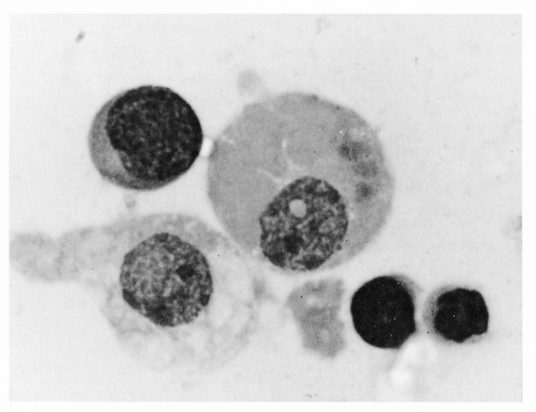 Figure 12.3 Trypanosomes in thin blood smears, x1 000 stained with Diff-Quick. a = Trypanosoma congolense: note absence of free flagellum; b = Trypanosoma vivax: note long free flagellum and large kinetoplast; c = Trypanosoma brucei: note polymorphism, prominent undulating membrane and free flagellum; d = Trypanosoma brucei dividing by longitudinal binary fission. (Unpublished photomicrographs by courtesy of Dr L. Logan-Henfrey, Laboratory for Research on Animal Diseases, PO Box 30709, Nairobi, Kenya)
