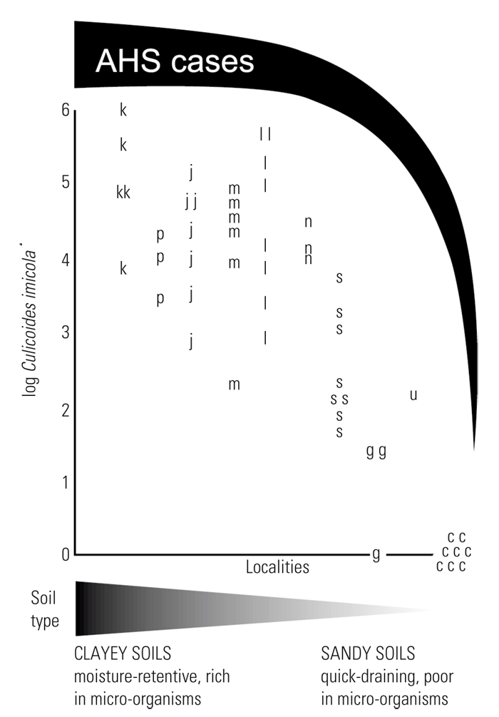 Certain species have a proven involvement in the transmission of at least two of the 15 OIE list ‘A’ diseases, namely bluetongue (BT) and African horse sickness (AHS). They also transmit epizootic haemorrhagic disease (EHD) of deer, and equine encephalosis (EE).116, 328 Thus, in sub-Saharan Africa, Culicoides are of great economic and veterinary significance. Indeed, it has been suggested that Culicoides midges were involved in two of the ten biblical plagues of ancient Egypt.210 This is not improbable, as the suppressant effect of Culicoides-transmitted disease must have manifested soon after the domestication of livestock some ten millennia ago. In support of this contention is that epidemics of devastating extent have occurred in the modern era, the most no table being when AHS swept through the Near and Middle East in 1959/60 causing an estimated 300 000 deaths.164 Another example is the AHS epidemic that decimated 70 000 equids in the then Cape of Good Hope Colony in southern Africa during the 1854/55 ‘season’.19 The unprecedented scale of the latter outbreak, which claimed 40 per cent of the colony’s total horse population in a mere eight months, attests not only to the efficiency of Culicoides as disseminators of infection but also to the modern-day necessity of protective annual vaccination. In eastern and southern Africa specifically this prophylactic regimen cannot be abandoned as it has long been known that there is a clear link between above average rainfall and outbreaks of Culicoides-borne orbiviral diseases.