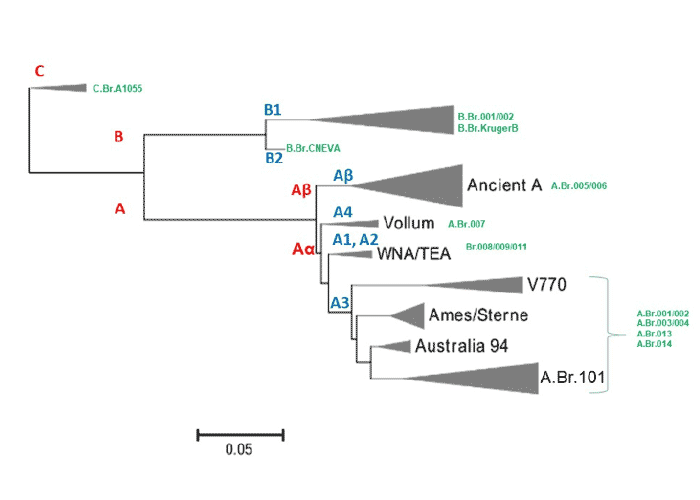 - TAMBORRINI, M., BAUER, M., BOLZ, M., MAHO, A., OBERLI, M. A., WERZ, D. B., SCHELLING, E., ZINSSTAG, J., SEEBERGER, P. H., FREY, J. & PLUSCHKE, G., 2011. Identification of an African Bacillus anthracis lineage that lacks expression of the spore surface-associated anthrose-containing oligosaccharide. Journal of bacteriology, 193, 3506-3511.