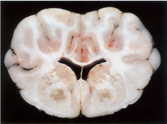 In sheep that have died from FSE, the only lesions consistently present, although they are frequently microscopic, occur in the brain. Those that have suffered from the acute FSE syndrome may also manifest some of the lesions present in pulpy kidney disease. Lesions in the brain are bilaterally symmetrical and two general patterns of distribution are recognized; areas of leukoencephalomalacia may be present in the internal capsule, dorsolateral thalamus, substantia nigra, basal ganglia and cerebellar peduncles,19 the most constant sites being the thalamus and the midbrain areas11 or the white matter of the frontal lobes. Areas of malacia are better seen in formalin-fixed brain tissue.