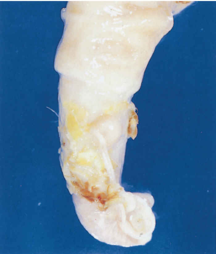 Often the penis can only be manually extruded with difficulty, if at all. The mucous membrane of the penis is severely inflamed, covered by a fibrinous or mucopurulent exudate (Figure 213.1), tear and bleed easily and contain small, scattered papulo-vesicular lesions which quickly develop into erosions or even ulcers. In some cases the erosions are extensive and ulcers may cover most of the glans penis. Ulcers of variable size may also occur at the preputial orifice, often completely surrounding it. If scabs are present, their removal exposes raw, bleeding surfaces covered by variable amounts of necrotic material. In severe cases, fibrosis and preputial adhesions result in phimosis. Paraphimosis, which is occasionally seen, culminates in extensive trauma and soiling of the penis. While clinical signs are developing, ewes which have been served will be noticed to have blood-stained hindquarters, particularly around the vulva and on the tail.