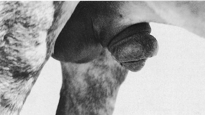 The interstitial or oedematous form is usually a manifestation of chronic infection, lasting several months to several years. A common clinical sign in both stallions and mares is progressive weight loss, with the animal eventually becoming severely emaciated (Figure 13.1). These debilitated animals are prone to infection by other pathogens and parasites, and many die from secondary causes.53 The interstitial form of the disease may or may not be associated with oedematous swellings in the early stages. Stallions show varying degrees of oedematous swelling of the sheath, glans penis and scrotum (Figure 13.2) and, in severe cases, the oedema may extend to the perineum and ventral abdomen and thorax (Figure 13.1). Such swellings are neither hot nor painful and often disappear after a few days, only to recur more severely within two to three weeks. The oedema may persist for up to 18 months after which the swellings often become permanent due to their organization by fibrous connective tissue.6 The penis may protrude and occasionally there is prolapse of the urethra.26 In mares, the vulva and perineum and occasionally the ventral abdomen and udder are swollen. In some cases, a viscous vaginal discharge is seen which may be copious. Hyperaemia of the mucous membranes of the vulva, vagina and clitoris is sometimes accompanied by a few nodules and ulcers which heal leaving white scars. Some mares show frequent micturition and behave as if continually in oestrus. In other countries, signs such as ulceration of the penis, frequent erections, and ocular manifestations such as photophobia, keratitis and corneal opacity have been reported, but these have not been recorded in southern Africa. Raised urticarial skin plaques, 40 to 50 mm in diameter, referred to as ‘silver dollar’ plaques, have only rarely been recorded in animals suffering from dourine in southern Africa.6, 58, 64