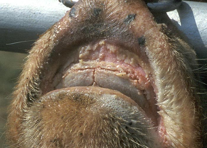 Figure 2 Multifocal ulcerative stomatitis (Courtesy by Drs J Mediger, C Chase and R Daly, The Department of Veterinary and Biomedical Sciences, Animal Research and Diagnostic Laboratory, South Dakota State University, Brooking, SD57007, USA)