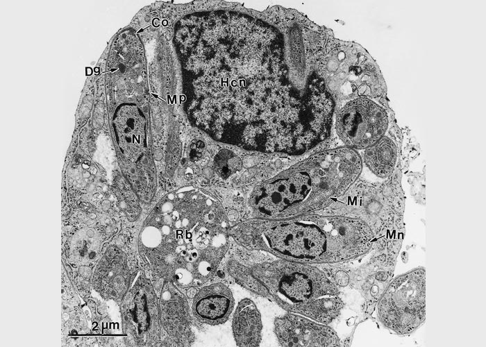 Figure 3 Transmission electron micrograph of a schizont of Sarcocystis neurona in a bovine monocyte showing merozoites budding from residual body (Rb). Some of the merozoites are still attached (arrowheads) to the residual body; conoid (Co); dense granule (Dg); host cell nucleus (Hcn); mitochondrion (Mi); microneme (Mn); micropore (Mp); nucleus of merozoite (N)