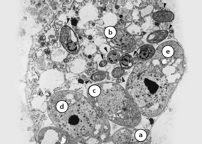 Figure 5 Degenerating host cell with eight individual merozoites and five developing schizonts (a to e) with single large nucleus. Sarcocystis neurona merozoites can form new schizonts without leaving the host cell. (From Dubey et al., 199139)