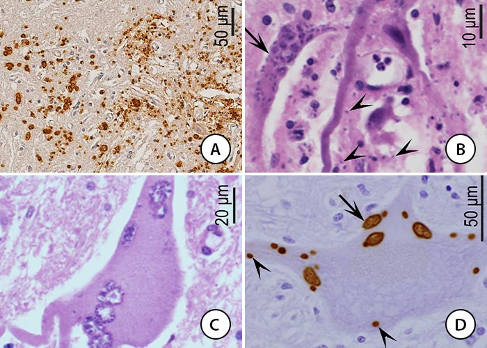 Schizonts and merozoites are detected generally in the cytoplasm of neurons, glial cells and macrophages and rarely in vascular endothelial cells. Immunohistochemistry (IHC) reveals many more organisms than in sections stained only with haematoxylin and eosin (HE) (Figure 8).
