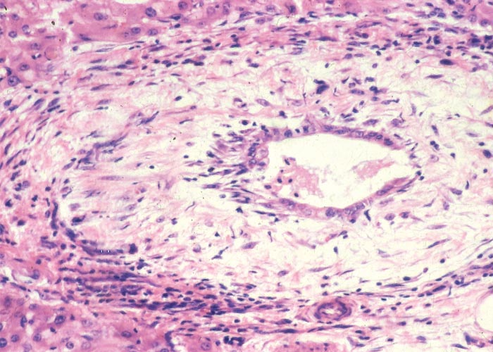 The microscopical changes in chronic aflatoxicosis in pigs and cattle are compatible with hepatic fibrosis and cirrhosis and are very similar to those reported for pyrrolizidine alkaloid poisoning (see seneciosis). In the late stage of poisoning, the lobular architecture is often distorted by intralobular fibrosis, which may be particularly prominent centrizonally, especially in cattle, giving rise to the so-called veno-occlusive lesions. Other changes include moderate to severe bile ductular proliferation, fatty metamorphosis (which is often severe in pigs and mild in cattle), karyomegaly and evidence of nodular hyperplasia.16, 58, 124, 125, 135, 182, 183, 204 Apart from the liver lesions, the epithelium of the proximal convoluted tubules in the kidneys may show mild degenerative changes, such as cloudy swelling and hydropic degeneration. Hepatic encephalopathy has been associated with aflatoxicosis in animals.49