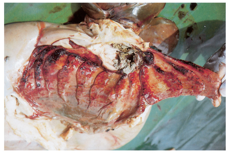 Haemorrhages may occur in the subserosa of the caecum, colon and gall bladder, below the capsule of the kidneys, in the mucous membranes of the female genital tract, especially after abortion, and lower respiratory tract. There may be pulmonary congestion with haemorrhage and alveolar oedema. The mucosa of the nasal cavity is often congested and manifests a catarrhal inflammation. The heart contains unclotted blood, its musculature is pale and flaccid, and petechiae and ecchymotic haemorrhages in the epi- and endocardium are present.