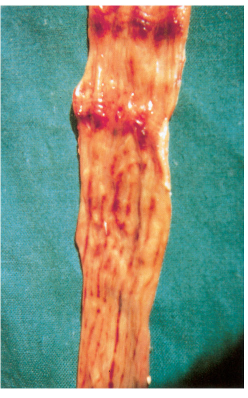 The necropsy picture is typical of a haemorrhagic diathesis accompanied by catarrhal or haemorrhagic inflammation of the gastrointestinal tract and, in ewes, the genital tract.2 The most prominent changes are found in the gastrointestinal tract and the kidneys. The lesions in the gastrointestinal tract consist of multiple haemorrhages of different size, located mainly in the longitudinal folds of the mucosa of the abomasum (Figures 96.1), distal part of the ileum and ileocaecal valve, caecum and proximal colon (Figures 96.2). The haemorrhages in the mucosa of the caecum and colon frequently appear as longitudinal striations while, in severe cases, lines of ecchymoses extend from the cranial caecum and the entire colon to the rectum. These mucosal striations are the most outstanding feature of the necropsy and in some the only evident lesion. They may, however, be absent in a small number of cases. The small intestine is often inflamed and the contents of colon and rectum, if present, are liquid.