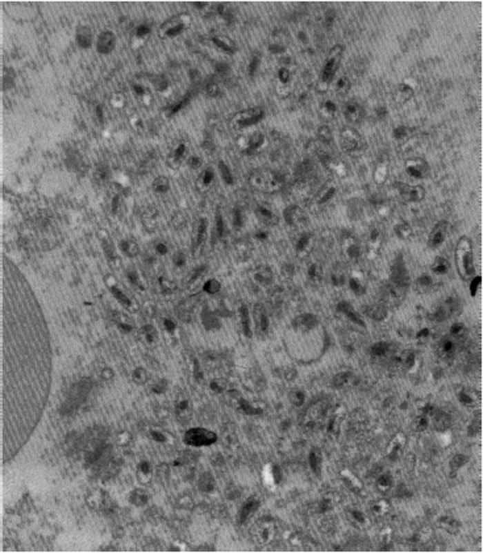 During infections, C. burnetii bind to receptors on monocytes/macrophages and are internalized in phagosomes which rapidly fuse with lysosomes to form phagolysosomes that appear as large vacuoles in infected cells.21 Coxiella burnetii is an acidophilic bacterium and its metabolism is enhanced by the acidic pH in the phagolysosome. 97 There are two distinct morphological forms of C. burnetii.53 The ‘small cell variant’ (SCV) is a compact, small rod with a very electron-dense centre of condensed nucleoid filaments while the ‘large cell variant’ (LCV) is a large, less dense, pleomorphic organism with a clear, periplasmic space between the outer and cytoplasmic membranes (Figure 43.1). A dense endospore-like body 130 to 170 nm in diameter might be found at one pole of some LCV (Figure 43.2). Both forms multiply by transverse binary fission. The SCVs are metabolically inactive and are the extracellular form of the organism. Once taken into the phagolysosome they are activated by the acidic environment and form LCVs, the metabolically active intracellular form of the bacterium. The cytoplasm of the host cell becomes filled with vacuoles loaded with organisms (Figure 43.3). ‘Large cell variants’ undergo sporogenic differentiation and form resistant, spore-like forms of the bacteria. These develop to SCVs that are released when the cells lyse.