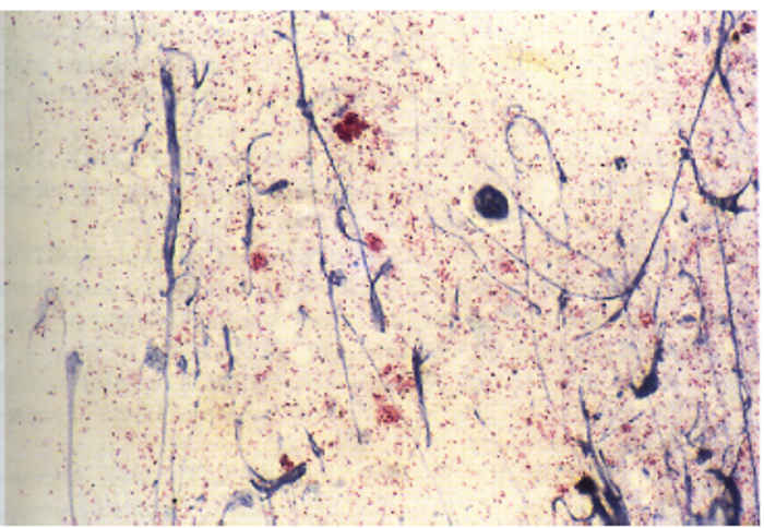 Staining with Giménez32 or the modified Ziehl-Neelsen stain (Figure 43.5)15 may be used to demonstrate organisms in impression smears made from affected cotyledons and chorion of placentas from animals that have aborted. Gram staining is unreliable, with C. burnetii appearing Gram positive under some conditions.33 Differentiating C. burnetii from other agents of abortion, for example Chlamydophila and Brucella, is often difficult in stained smears and immunofluorescence with mono- or polyclonal antibodies is recommended. This technique may be used on fresh and paraffin-embedded tissues. Organisms may also be detected with immunoperoxidase assays19, 89 and capture enzyme-linked immunosorbent assay (ELISA) or ELIFA84 but these techniques require fresh tissue. Care should be taken in interpreting results as C. burnetii may also be found in placentas of healthy sheep and goats.95