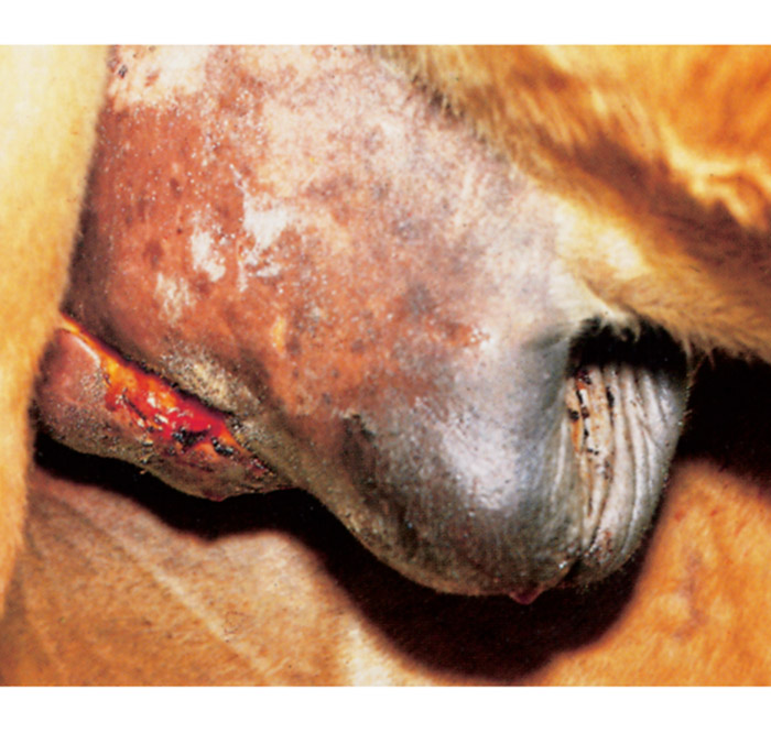 In the differential diagnosis of staphylococcal dermatitis, orf (see Orf) and dematophilosis (see Dermatophilosis) should be considered. In the case of staphylococcal dermatitis, removal of a scab reveals a deep ulcer, whereas in orf the scabs cover areas of granulation tissue.18 Dermatophilosis can be distinguished from staphylococcal dermatitis by making a smear of the exudate below the crusts and by demonstrating Dermatophilus congolensis after the smear has been stained with Giemsa or other suitable stains.