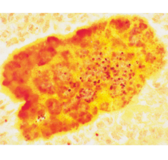 The definitive diagnosis of botryomycosis rests on the results of bacteriological and histopathological examination of the lesions. In the latter case, the application of special staining techniques may be required (Figure 169.2). Botryomycotic granulomas have an identical macroscopic appearance to those of eumycotic mycetomas (see Mycoses) caused by true fungi, and granulomas caused by Actinomyces and Nocardia spp.3